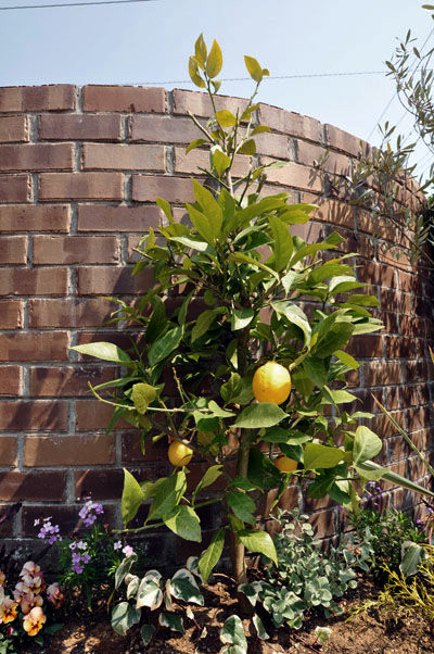 奥様の「常緑樹だけで」というリクエストで、塀の外側にはレモンとオリーブ、内側にはシマトネリコ、ドラセナ、シルバープリペットを。
