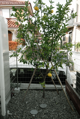 家の裏手、道路側に、ナツミカンを植えました。冬の花が少ない時期に実をつけますので、ご近所の景観をあったかい感じにしてくれます。