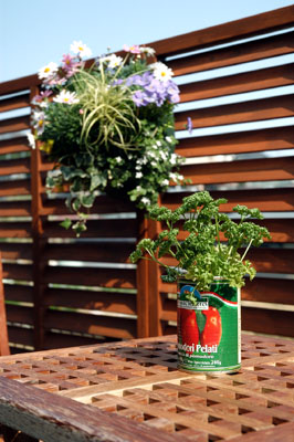 Plan Aはウッドデッキ、リビングの外が狭めなときにはこのようにリビングと段差をつけないで敷地いっぱいまで広げるのが最も有効です。それと既存のフェンスに結束するという簡単施工で市販のルーバーフェンス(耐久性に難ありですが、価格が低いので壊れたら取り替えればいいという選択です)で目かくしするというプランです。
