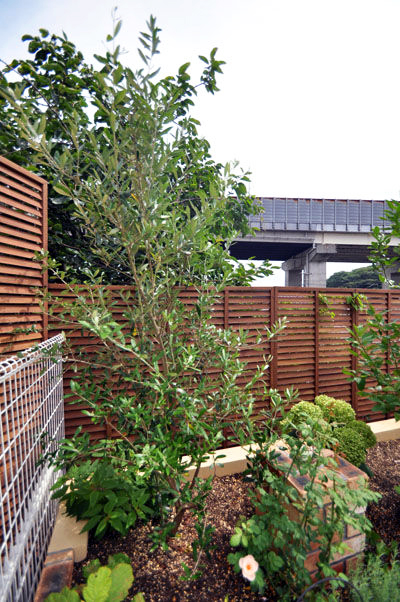 外周には目隠し塀と、その手前に植え込みがあります。レンガで高さを出して土を入れたので、ふんだんに樹木を植えることができました。