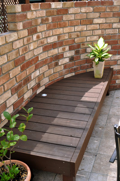 バーベキューコーナーは腰掛けた時に目が当たる高さのレンガ塀を設置しました。