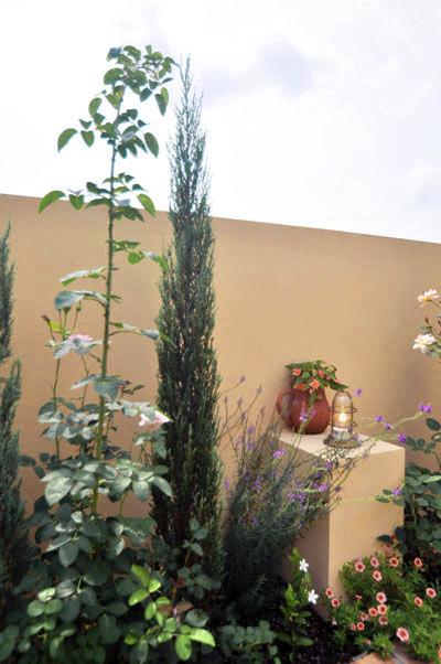 母屋の脇に立つガレージの屋上に出現した空中庭園は、あの手この手で地上の庭よりも魅惑的な場所になりました。